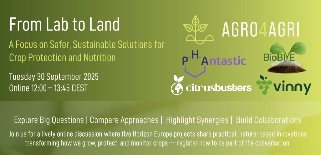 Join us for a collaborative webinar featuring Horizon Europe projects AGRO4AGRI, BioBIVE, Citrusbusters, PHAntastic, and VINNY. Discover how cutting-edge research is transforming agriculture through innovative approaches to crop protection and plant nutrition, aligned with Safe and Sustainable by Design (SSbD) principles.